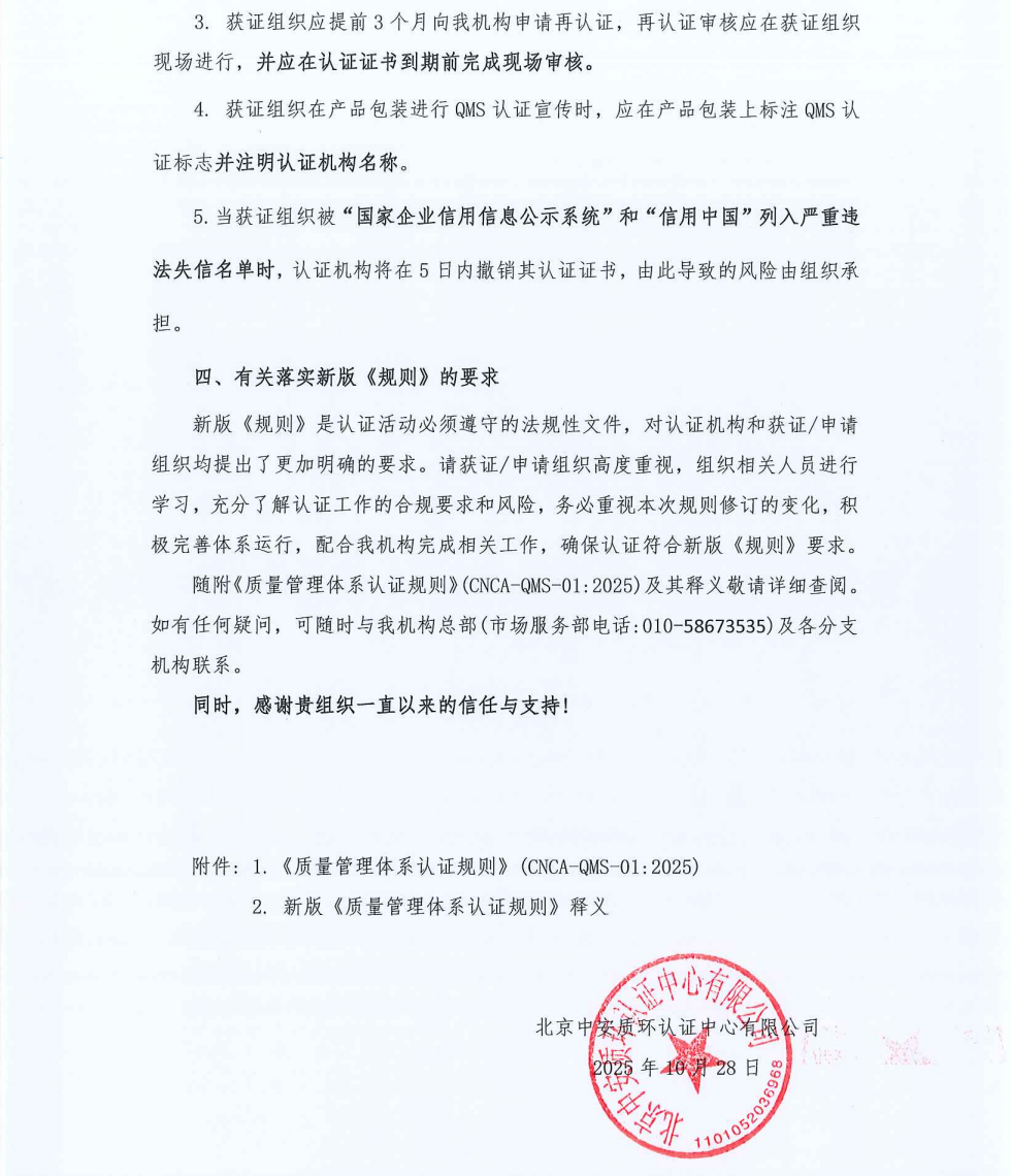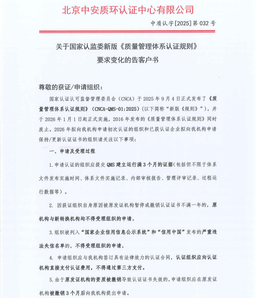 关于国家认监委新版《质量管理体系认证规则》要求变化的告客户书